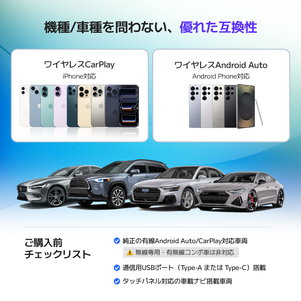 AAWirelessは全世界的に10,000台以上の車に対応しており、有線Android Autoが搭載された全ての車で使用出来ます。