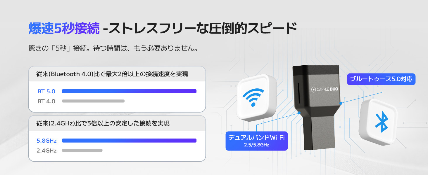 - 【2.4GHz/5.8GHzデュアルバンドWiFi & BT5.0の安定接続】2.4GHz/5.8GHzのデュアルバンドWiFiとBluetooth 5.0を採用し、従来比で最大3倍以上の安定した通信を誇ります。走行中も常に安定したパフォーマンスを発揮し、安全でスムーズなドライビング体験を提供します。さらに、2台のスマホを同時に記憶できるため、夫婦や家族で車を共有する際にも便利です。