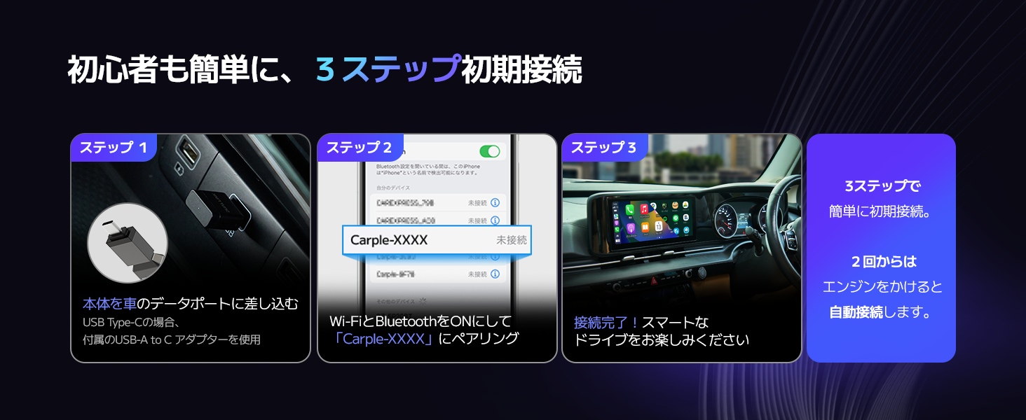 - 【驚異の5秒接続・4way純正操作対応】次世代チップの搭載により、 最短5秒の圧倒的な起動速度を実現しました。初心者でも安心な3ステップの簡単設定で, 接続後はタッチパネル、ステアリングボタン、ダイアル、音声操作(Siri/Googleアシスタント)といった純正の操作感をそのまま維持できます。ストレスフリーで直感的な操作が、快適なドライブをサポートします。