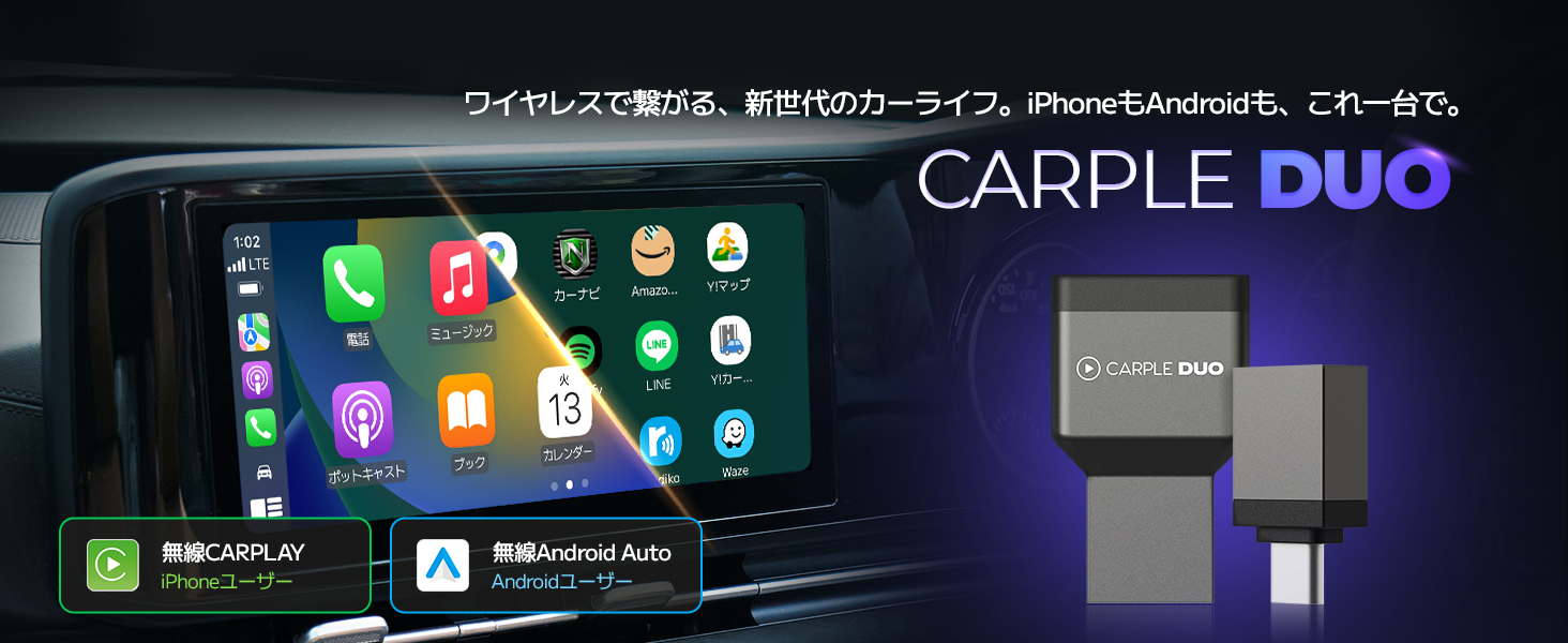 - 【ワイヤレス化の決定版!CarPlay & Android Auto 2in1】CARPLE DUOは、純正の有線apple CarPlayおよびAndroid Auto機能を搭載した車両に接続するだけで、煩わしいケーブルのないワイヤレス環境を完成させます。一度ペアリングすれば、後はエンジンをかけるだけで最短5秒でスムーズに再接続され、毎回スマートフォンを取り出す必要なくCarPlay、Android autoを使えます。【あらゆる機能を車内の大画面で自由自在に】いつものスマホのアプリを、車内の大画面で快適に操作できます。Googleマップ・Appleマップなどのナビはもちろん、Spotify・Apple Musicでの音楽再生、ハンズフリー通話まで全て対応します。