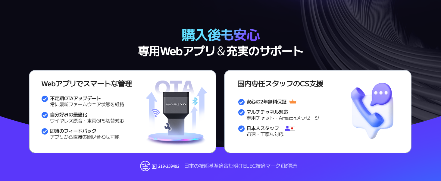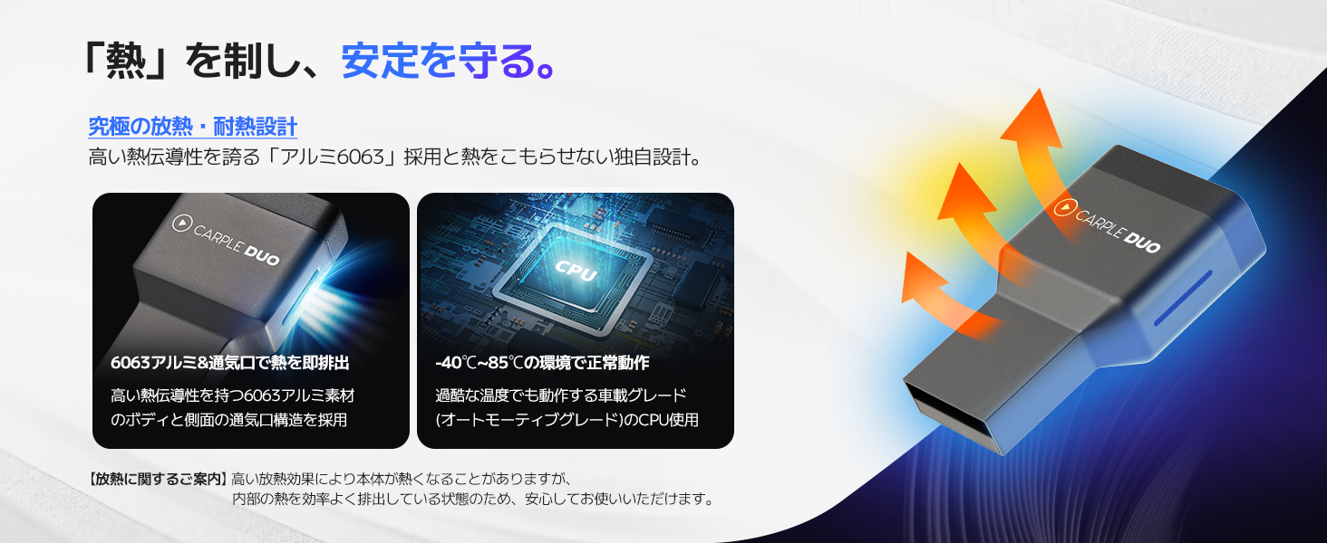 - 【安心の技適認証済み(TELEC)&過熱保護機能】Carple DUOは、TELECの技適マーク(技術基準適合証明/認証番号:219-259492)を取得しており、安心してご使用いただけます。過熱保護機能に加え、熱伝導率の高い「高品質アルミ放熱構造」を採用。使用中に本体が熱くなることがありますが、これは内部の熱を効率的に外へ逃がしている放熱効果によるものですので、故障の心配はなく安心してお使いいただけます。