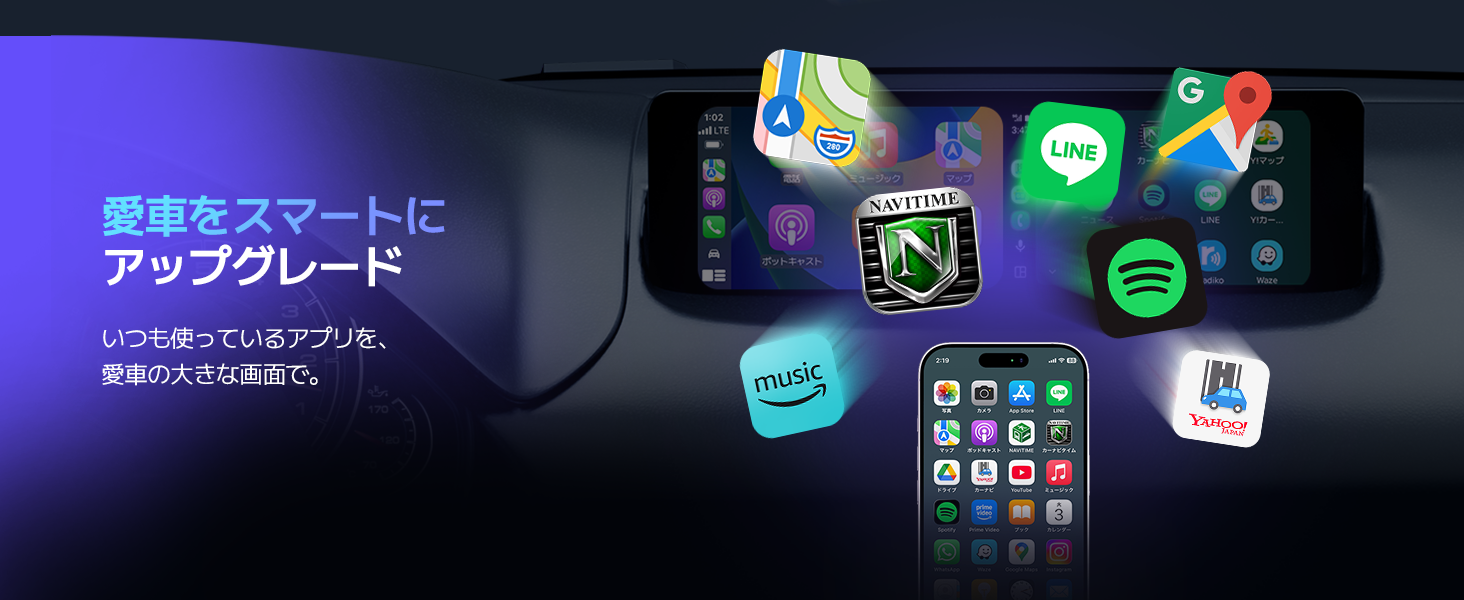 - 【あらゆる機能を車内の大画面で自由自在に】いつものスマホのアプリを、車内の大画面で快適に操作できます。Googleマップ・Appleマップなどのナビはもちろん、Spotify・Apple Musicでの音楽再生、ハンズフリー通話まで全て対応します。